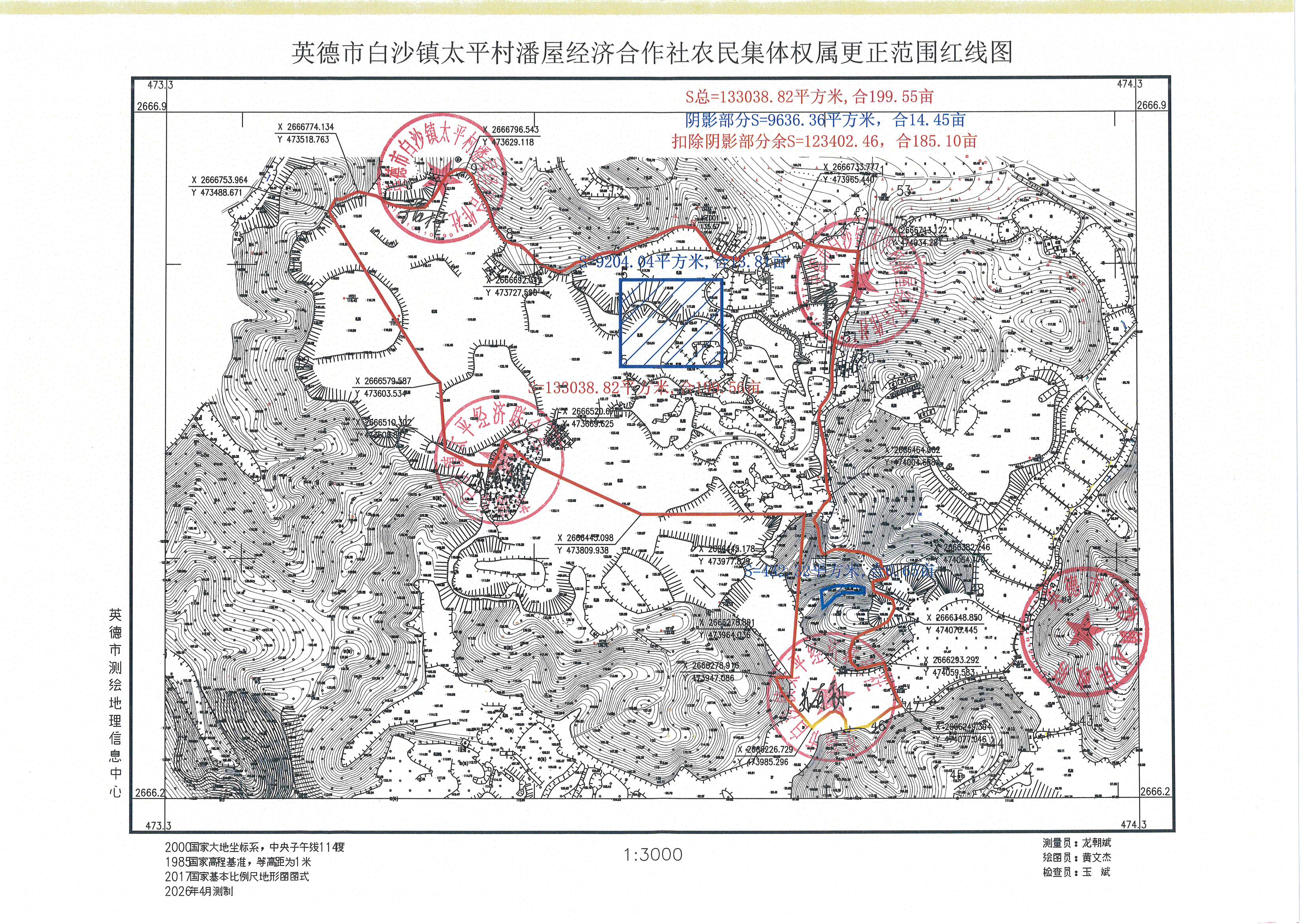 英德市白沙镇太平村潘屋经济合作社农民集体的1宗农民集体所有权土地(具体位置见附图),宗地面积123402.46平方米,上述土地在农村集体土地所有权调查确权时,误将其指认为英德市白沙镇太平经济联合社农民集体所有。经相关权利人实地指认,上述土地实际属于英德市白沙镇太平村潘屋经济合作社农民集体所有。现对申请权属更正情况进行公告,如对公告有异议者,请在公告后15个工作日内向市自然资源局提出书面意见;如无异议,我局将予以更正登记。