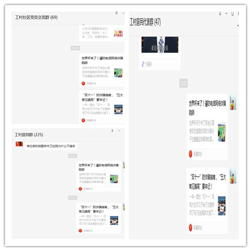 为做到宣传的全面覆盖,社区干部充分发挥各个社交媒体平台的作用,积极开展线上宣传。主要是充分利用微信群这个宣传主阵地,在镇村干部群、村(居)工作群、村小组群、亲戚朋友群、家庭群等群组广泛宣传。通过一传十、十传百、层层传递的方式,做到防范养老诈骗宣传全面覆盖社区内的全部居民。