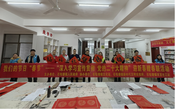 为弘扬中华传统文化和深入学习宣传贯彻党的二十大精神,营造吉祥如意的春节氛围,弘扬积极向上的道德风尚,充分表达石牯塘镇书法爱好者热爱家乡、喜迎新春的美好情怀。农历腊月廿一(即1月12日),在新春佳节到来之际,石牯塘镇文化站、新时代文明实践所、双百社工站、英德市百鸟堂原生态旅游有限公司工会联合组织一场赠送春联的公益活动,以此将节日的美好祝福送达广大村(居)民朋友,表达党委、政府对辖区内人民群众的关爱。