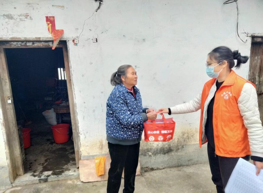 “邓阿姨,这是市妇联送给重点人群的‘健康防疫包’,有抗原和口罩,方便不时之需,疫情期间注意做好防护啊!”