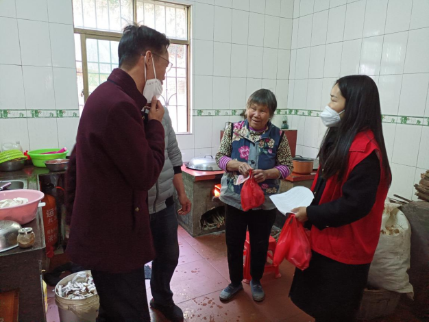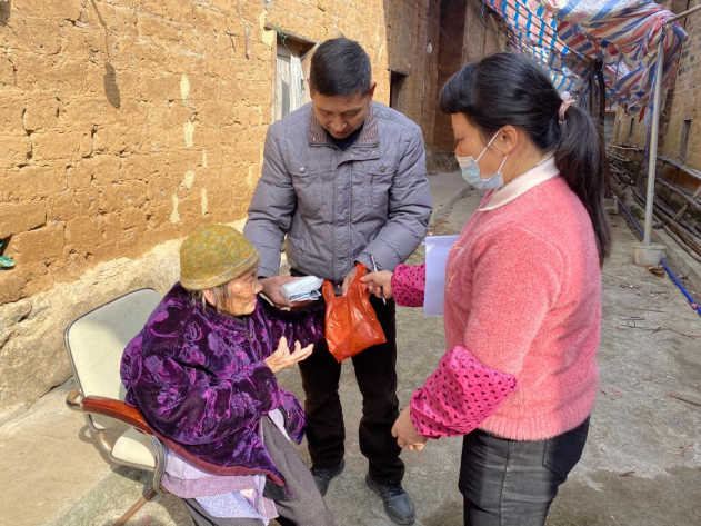 镇村党员干部入村入户为老人送上“健康防疫包”