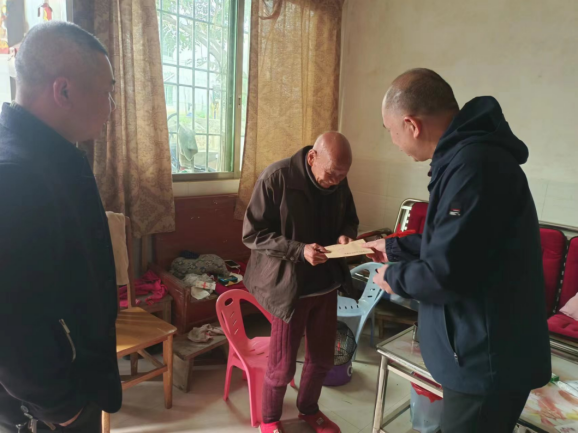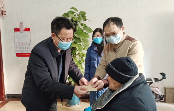 镇党委副书记、镇长陈光(左一)为离退休老干部蓝兴送上慰问金和抗寒生活物资