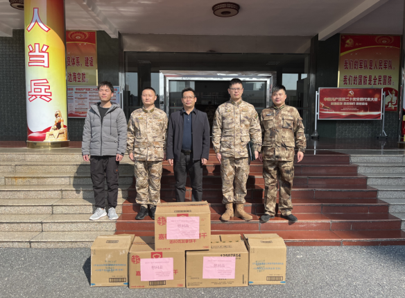 镇党委副书记、镇长陈光(正中)为市武装部、市消防大队上慰问金和抗寒生活物资