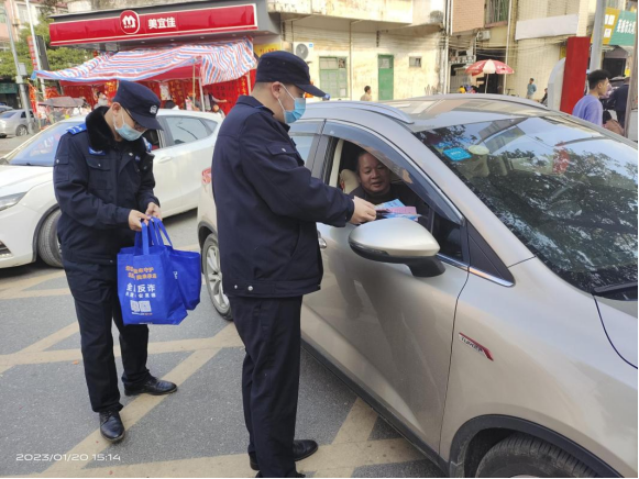镇派出所党员干辅警在春节前到镇墟主要道路宣传交通安全知识,引导车主有序通行
