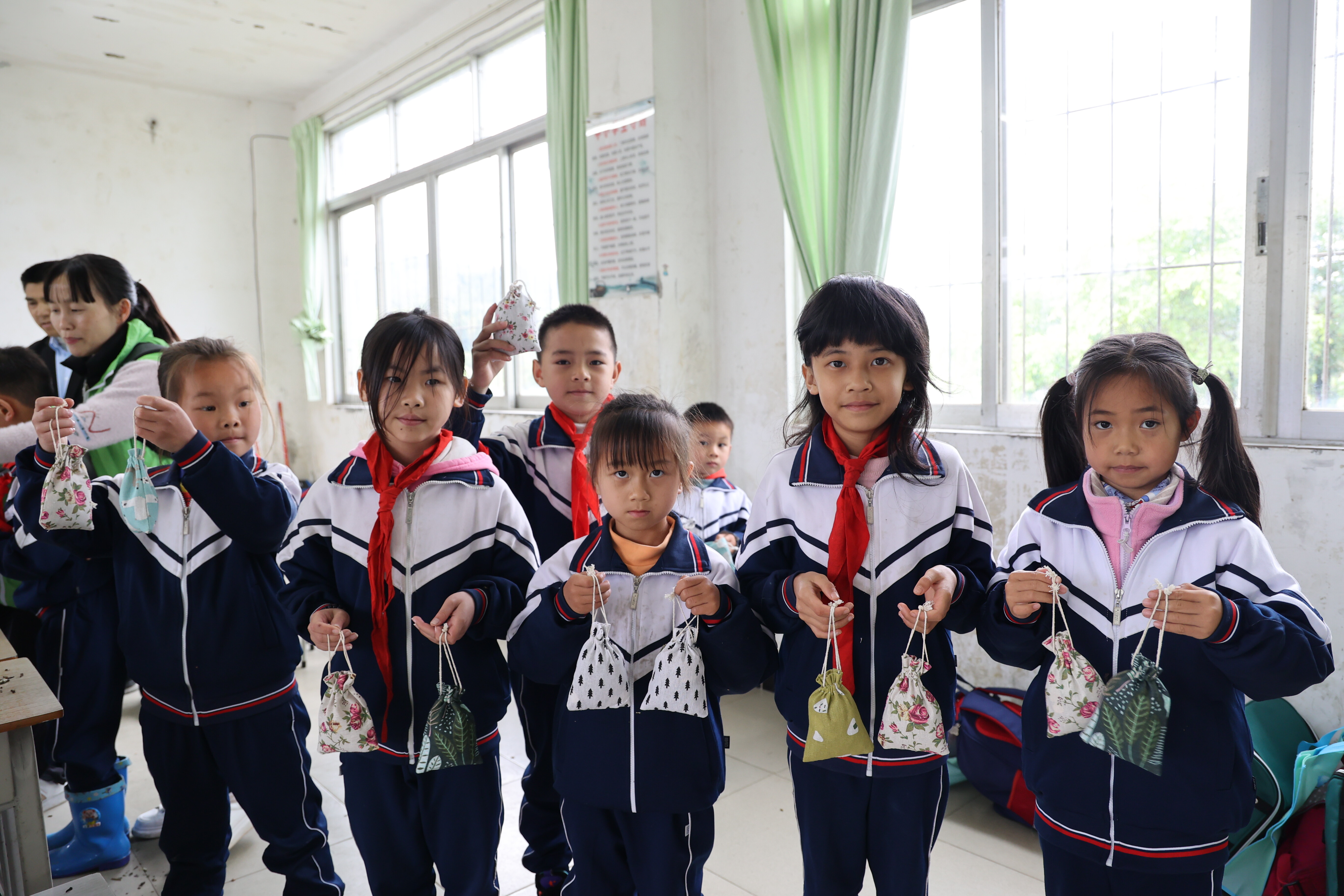 “我的香囊好香啊!”“我的香囊好好看啊!”“我妹妹一定会喜欢的,我还想做几个呢!”大家开心地拿着的香囊挂炫耀起来,意犹未尽,表示还想再做几个。手捧着自己的劳动成果,同学们忍不住看了又看,摸了又摸,闻了又闻,沉浸在成功的喜悦中。