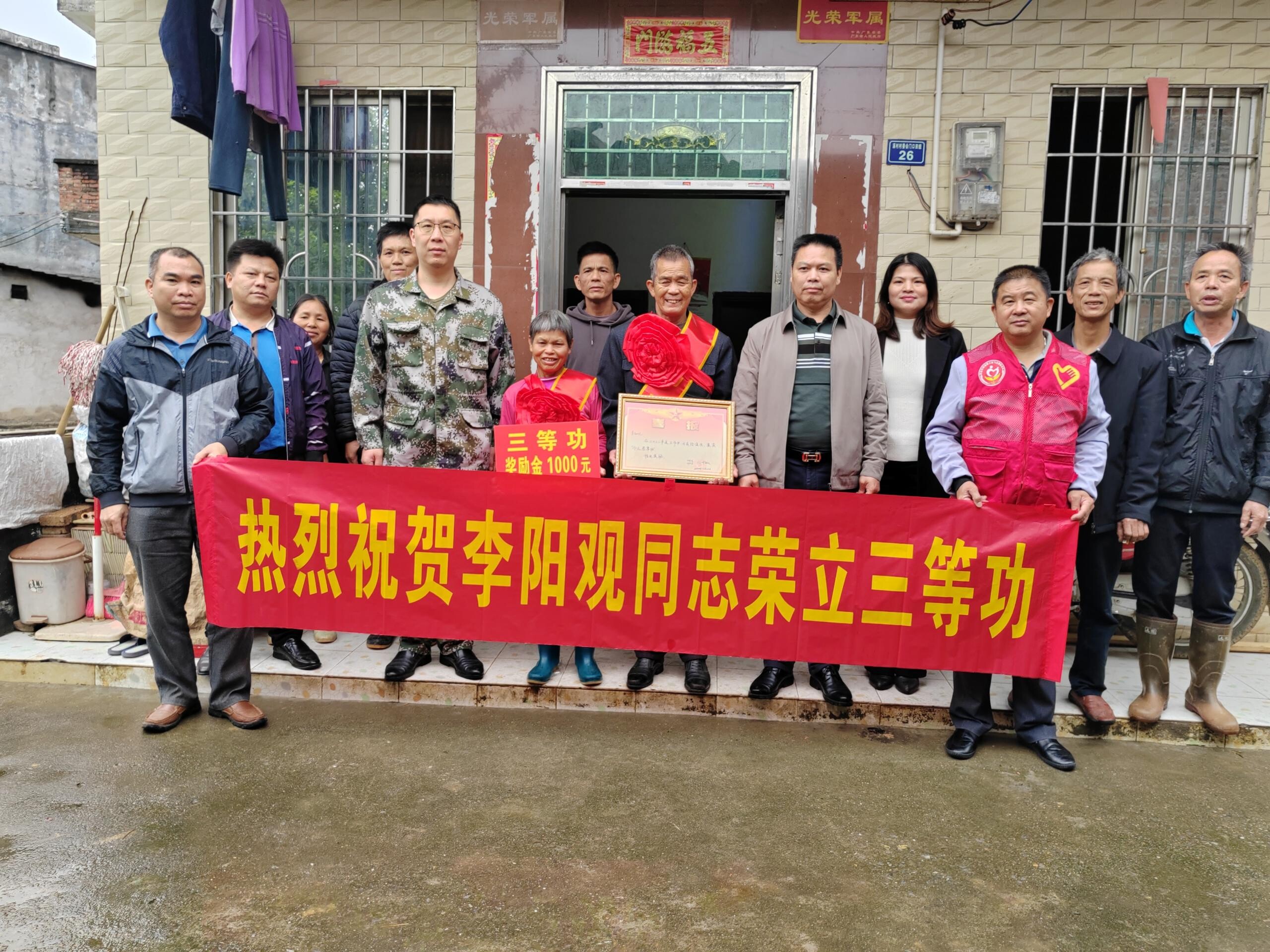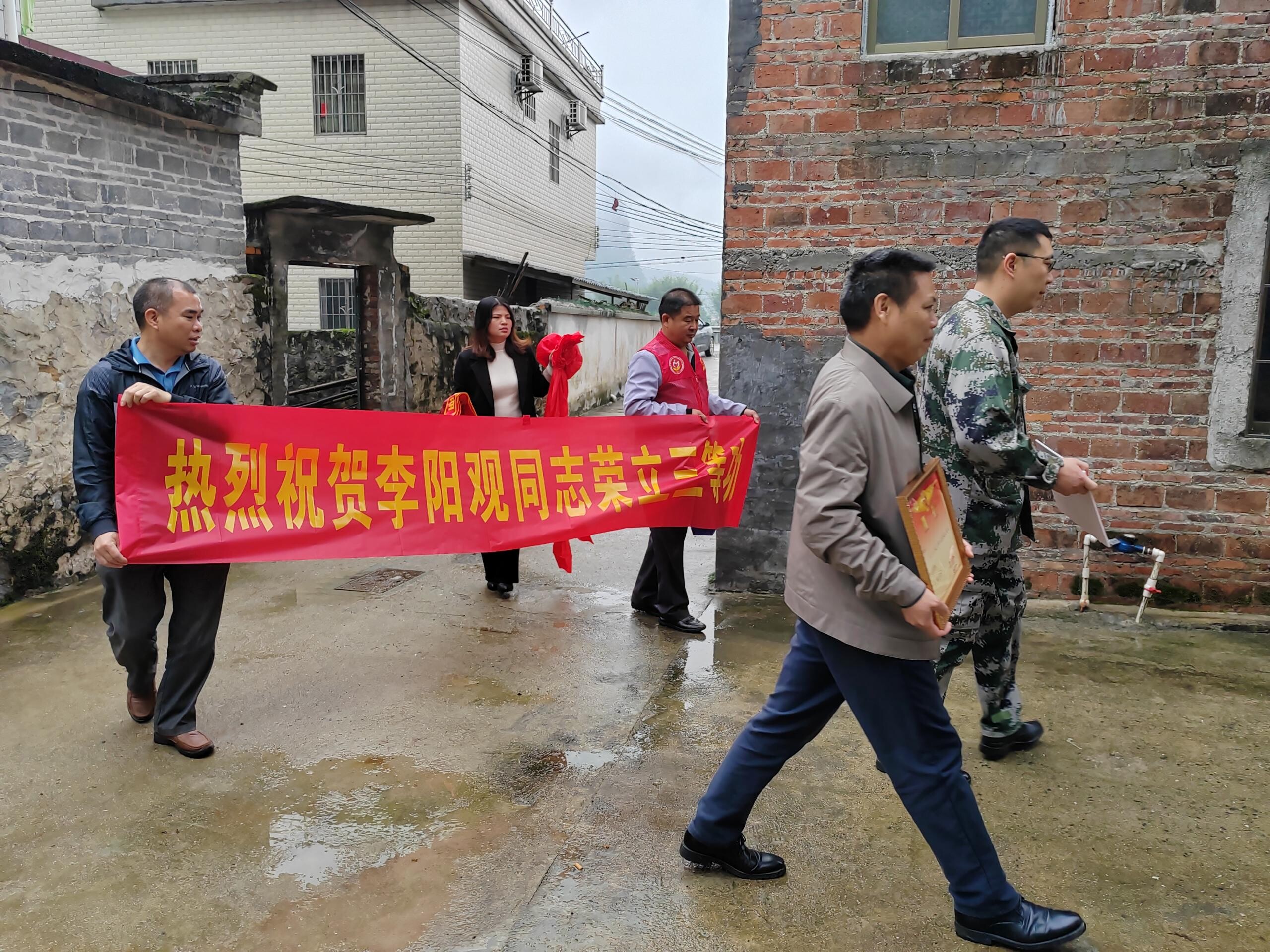 为进一步营造拥军优属的浓厚氛围,增强现役军人家庭的荣誉感,2023年4月11日,英德市退役军人事务局副局长罗标、黄花镇党委委员肖国斌、武装部专武干部、退役军人服务站工作人员到黄花镇溪村村荣立三等功的现役军人李阳观家中为其送上喜报。