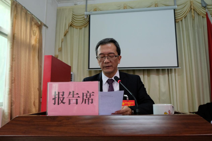 镇党委书记陈斌代表中国共产党大湾镇第十六届委员会向大会作报告