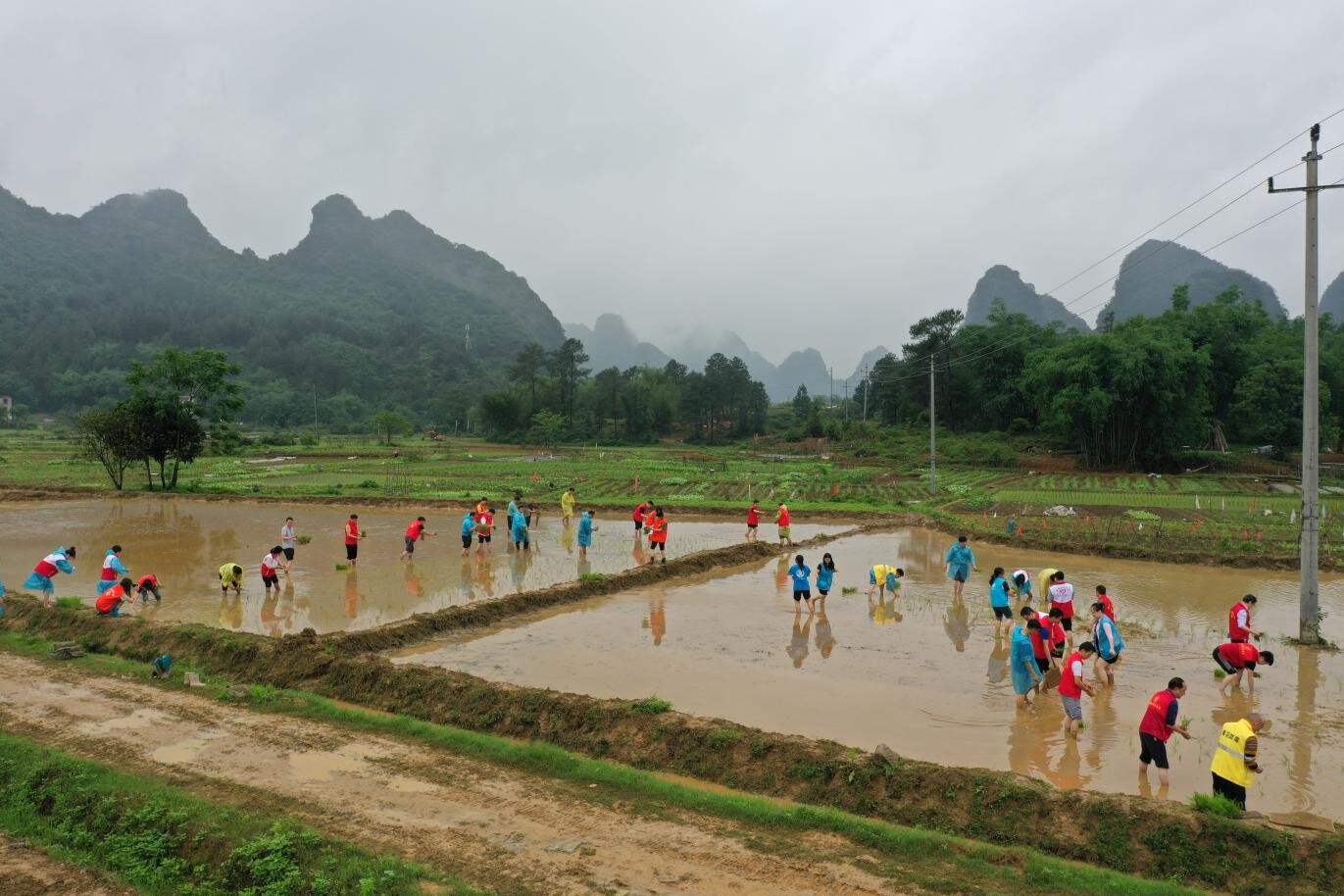 田间地头里,参与活动的人员卷起袖子、撸起裤脚,集体“扎”进水田,运送秧苗、秧田拋秧,秩序井然,呈现一派热火朝天的春耕繁忙景象。