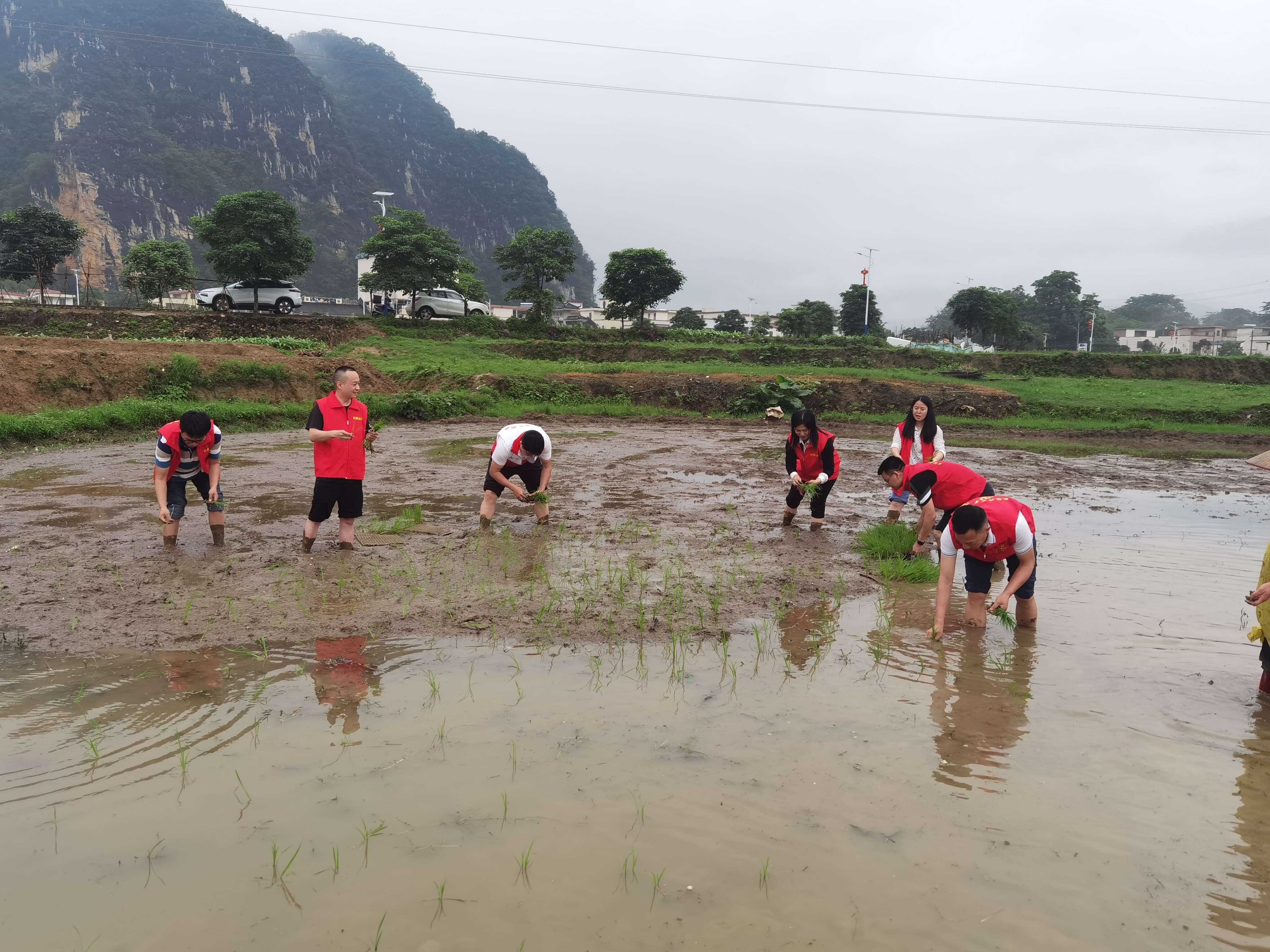 随后,大家在公正村开展“义务插秧助春耕,粮食安全有保障”志愿活动。在稻田里,同志们踩着泥泞,俯下身子,抛插秧苗,经过2小时的载作,方方正正的水田披上了“绿衣”。