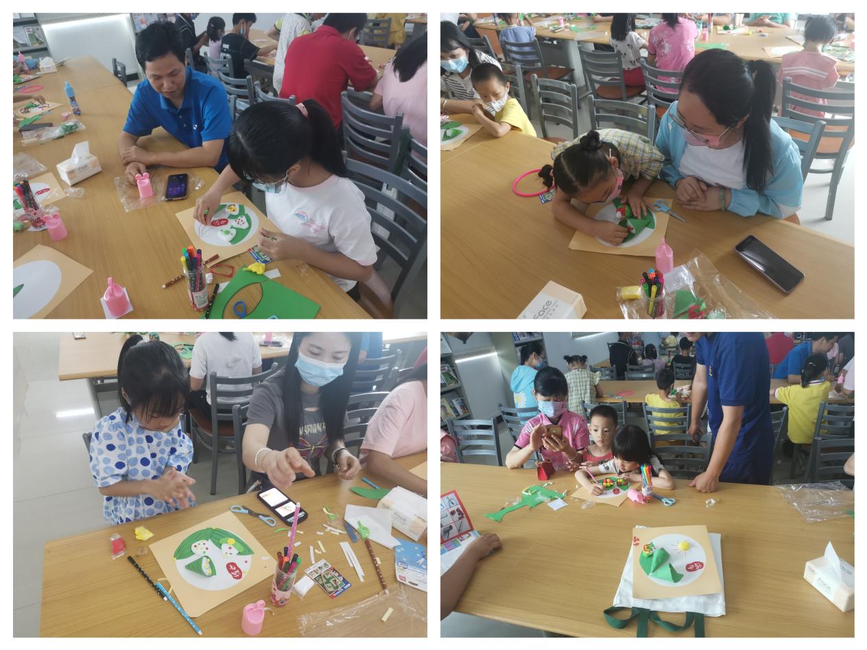 接下来是粽香飘飘贴画制作环节,工作人员为小朋友们分发制作手工所需的工具和材料,讲解着贴画的制作方法。听完讲解,孩子们迫不及待地动起手来,在家长的陪伴下细心地裁剪、描绘、粘贴、塑形。在大家的巧手中,一幅幅栩栩如生的粽子贴画制作完成,小朋友们脸上也乐开了花。