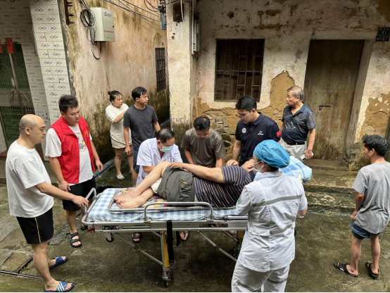 党员干部和医护人员利用担架运送辖区内被困中风人员