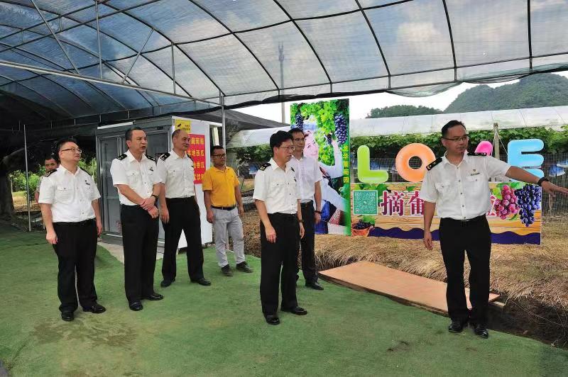 英德红茶、清远鸡、麻竹笋等都是清远重点打造的五个百亿产业项目,也是广州海关、中国长城资产公司广东分公司对口帮扶的英德市横石塘镇的特色农产品。为了加大对地方的帮扶力度,扩大农产品出口,发挥对当地经济的支撑和拉动作用,6月27日,广州海关党委委员、副关长杨国海带队到英德市开展乡村振兴调研,并与清远市农业农村局、英德市、横石塘镇政府及相关部门负责人和出口农产品企业代表座谈,广州海关进出口食品安全处、植物检疫处、工会、清远海关、驻镇帮镇扶村工作队负责同志参加 。 调研组一行来到横石塘镇博物馆、龙华村委会、龙华葡萄园、积庆里红茶基地等地深入了解驻镇帮镇扶村工作成效,了解龙华村乡村振兴工作成果。龙华葡萄采摘园是驻镇帮镇扶村工作队重点引进的一项产业振兴项目,于2022年建成并投产,总面积50亩,其中第一期20亩,种植夏黑、阳光玫瑰等4个品种葡萄,首年产量每亩在2000-3000斤。在广东省农业科学院相关单位大力支持下,目前正在向产、学、研基地方向发展打造。调研组一行来到积庆里红茶谷茶园,了解了积庆里茶业的发展现状及英德红茶产品的市场情况。