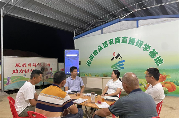 2023年7月的一天,位于青北村红松茸基地的直播研学基地,农民学员们在夜色里正式开始了第一次直播。青塘镇党委书记杨振华、工作队队长张德虎也在现场学习、调研。