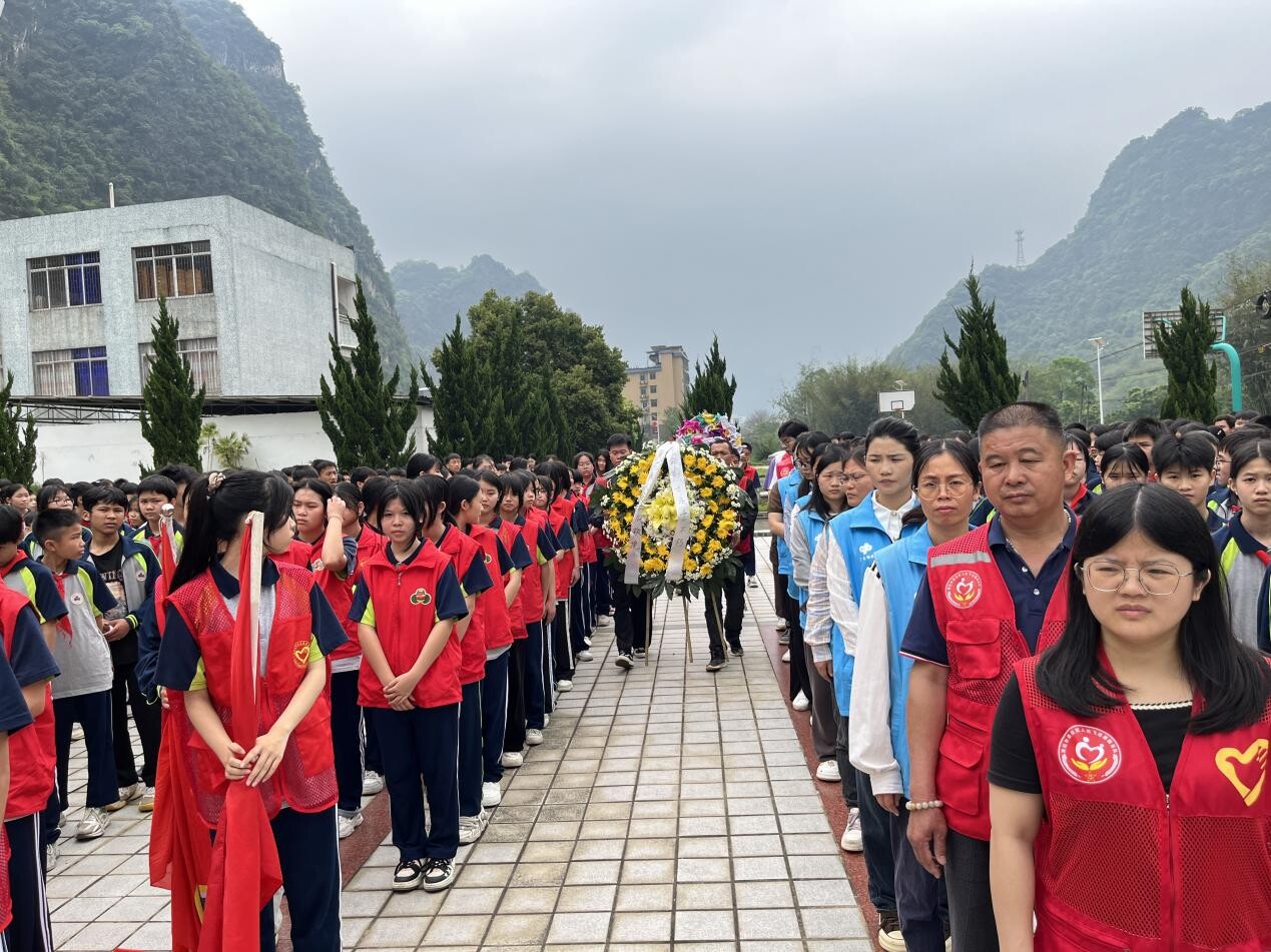 活动中,全体人员整齐列队,肃立在革命烈士纪念碑前,随着庄严的国歌奏响,大家心怀敬意,共同向英勇牺牲的烈士们致以崇高的敬意。退役军人达飞志愿者、师生代表向革命纪念碑敬献花圈,而后全体人员依次瞻仰烈士纪念碑,向烈士碑默哀一分钟,表达对先烈们的无尽哀思和深切缅怀。