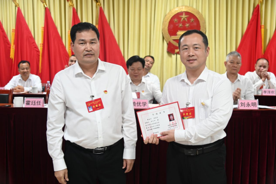 图为:镇人大主席李红伟为新当选镇长霍珏任颁发当选证书
