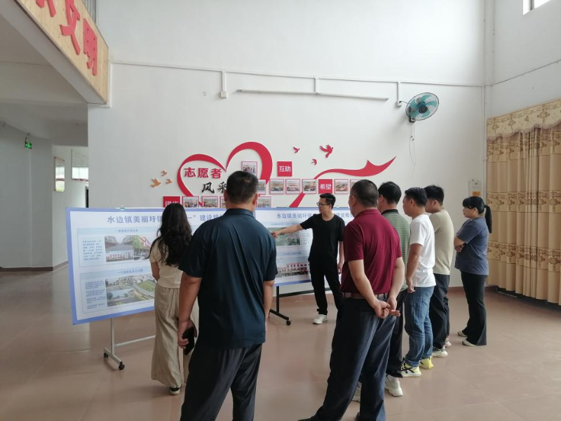 本次调研以“规划展板+现场观摩”为主线,第一站抵达水边镇文化站,集中参观“七个一”建设规划展板。镇“百千万工程”办公室系统汇报入口通道改造、外立面提升、农贸市场升级等七大项目规划蓝图与阶段性成果,重点展示圩镇客厅“一老一小”服务功能融合设计及绿美生态小公园“半小时休闲圈”建设理念。