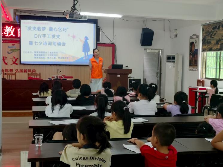 为传承和弘扬中华优秀传统文化,培养儿童对传统文化的兴趣,增强文化认同与文化自信,同时激发创造力与动手能力,8月28日下午,黎溪镇妇联、镇关工委、镇团委与镇新时代文明实践所联合壹基金儿童服务站,共同举办了“发夹载梦·童心乞巧”DIY手工发夹暨七夕诗词朗诵会。