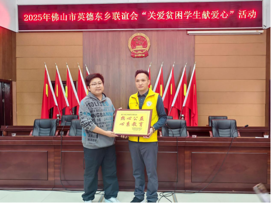 捐赠结束后,现场举行了简单而庄重的牌匾颁发仪式。为感谢佛山市英德东乡联谊会长期以来对桥头镇教育公益事业的关心与支持,林晖代表桥头镇社工站,向联谊会颁发了“热心公益 心系教育”牌匾。张如养会长接过牌匾,他表示,这份荣誉既是肯定也是责任,联谊会将继续坚守公益初心,持续关注家乡教育事业发展,为更多贫困学子送去温暖与希望,用实际行动为家乡教育添砖加瓦。