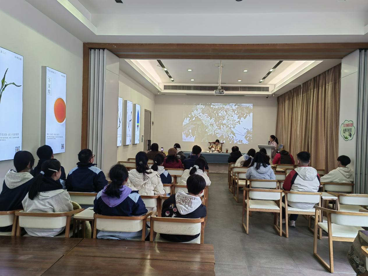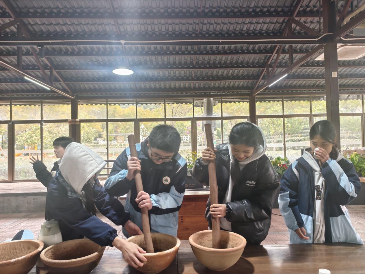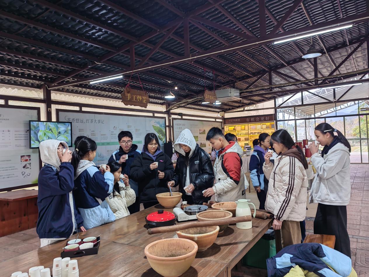活动中,驿站工作人员联合茶谷专业导师,为学生量身打造了“理论+实操”的特色研学课程。在茶文化展厅,学生们通过图文讲解、实物陈列,系统了解英德茶产业发展历程及黄花镇茶旅融合产业布局,知晓家乡茶资源的独特优势;此外,学生们沉浸式走进茶的世界,静赏茶艺展演的行云流水,细品佳茗的醇厚回甘,在一观一品间领略茶艺的雅致魅力,体悟茶文化的深厚精髓;最受学生欢迎的擂茶体验环节,导师详细讲解擂茶的历史渊源、食材搭配及制作技巧,学生们亲身参与擂茶制作全流程,在欢声笑语中品味非遗技艺的独特韵味。