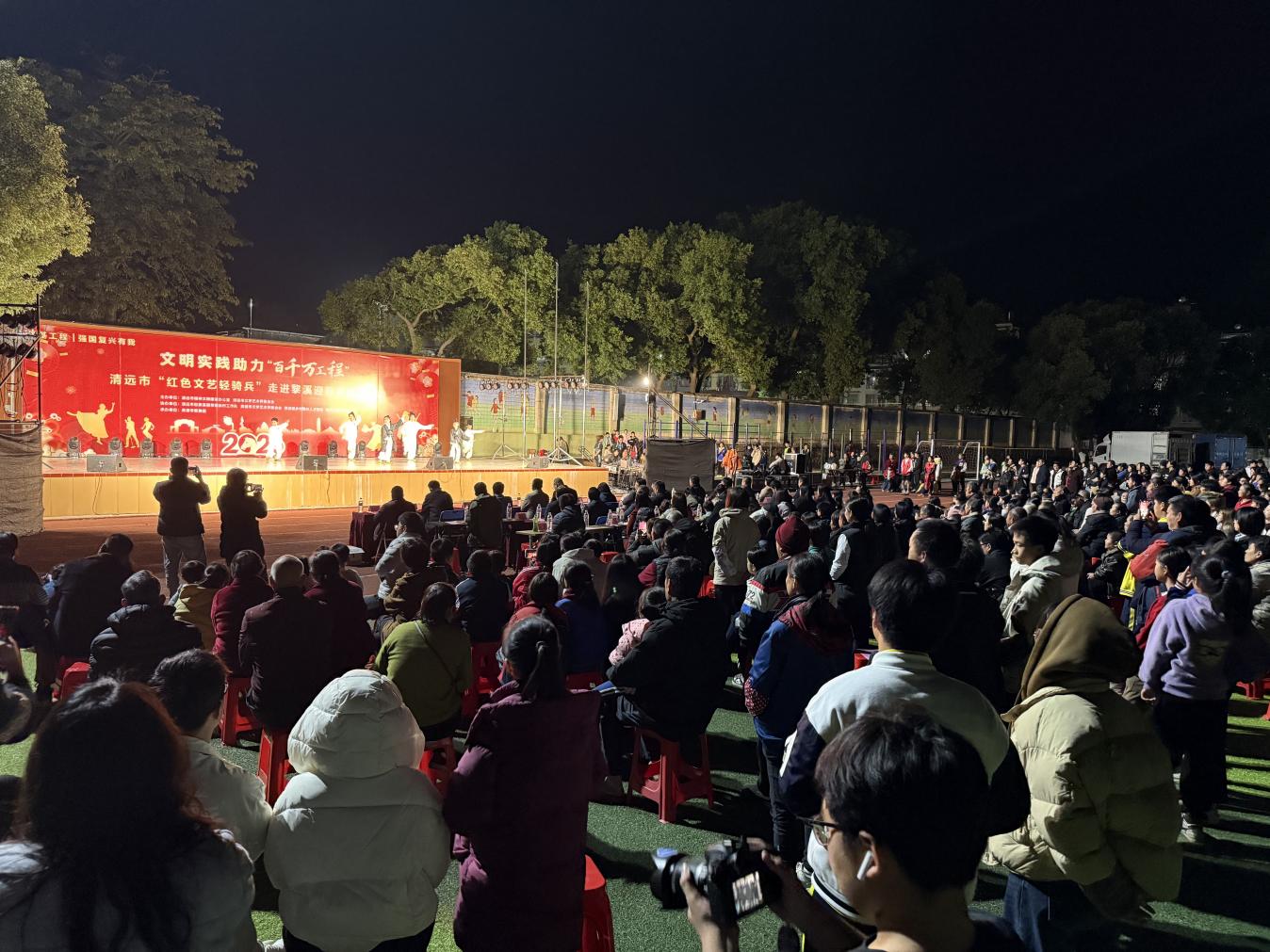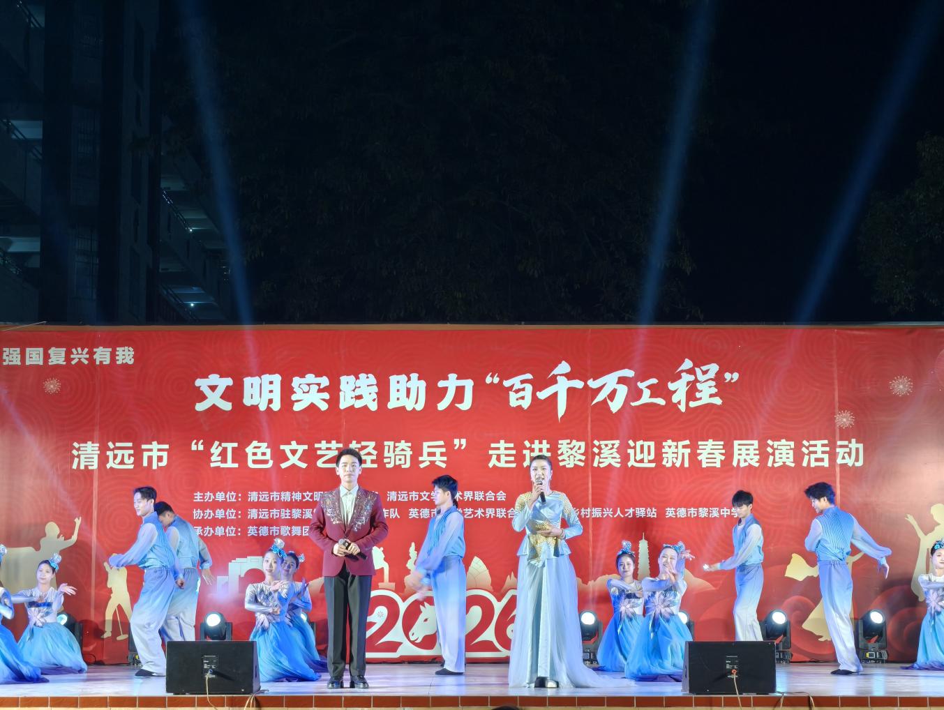 1月27日,英德市黎溪中学灯火璀璨、暖意融融,文明实践助力“百千万工程”2026年清远市“红色文艺轻骑兵”走进黎溪迎新春展演在此举办。活动吸引1000余名村民携亲伴友到场观看,大家欢聚一堂,在欢声笑语中共庆马年新春,感受乡村文化盛宴的独特魅力。