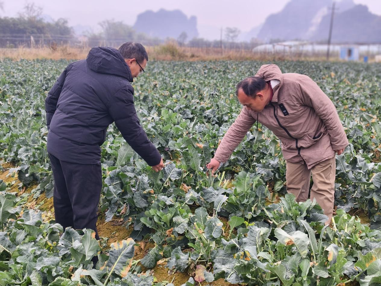 活动中,文水明深入种植基地实地察看西兰苔生长情况,结合露天种植特点,围绕适期管护、自然气候应对、水肥管理、露天病虫害绿色防控等核心要点,向种植户陈运镜细致讲解露天种植注意事项,针对田间实际问题逐一答疑解惑,分享贴合户外种植的实操技巧,确保农户听得懂、能掌握、用得上。
