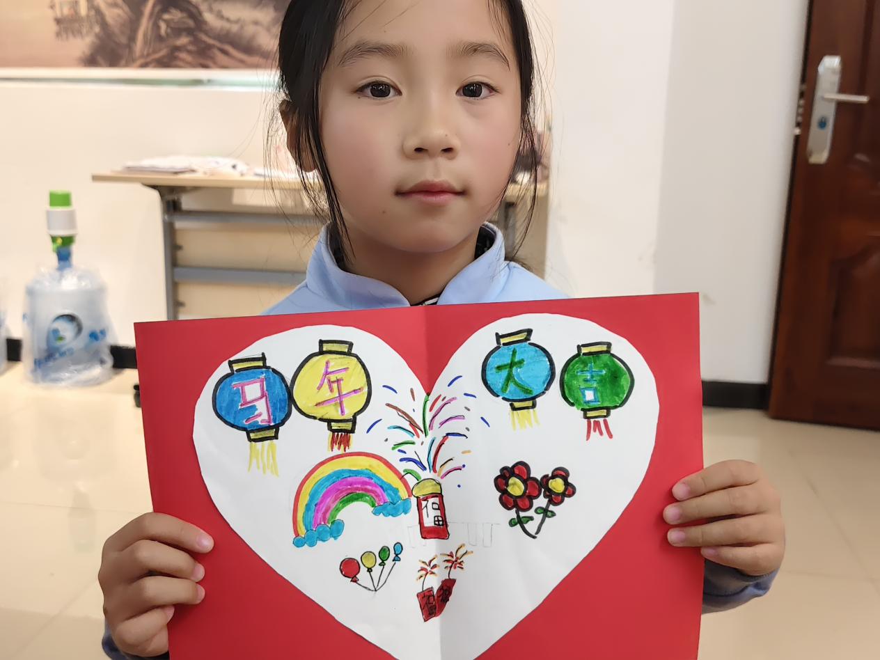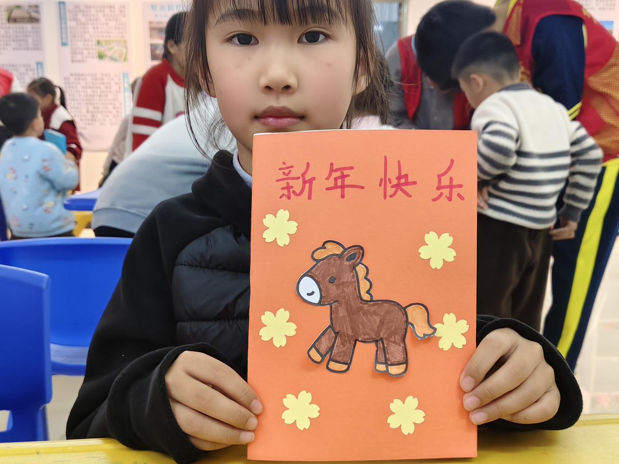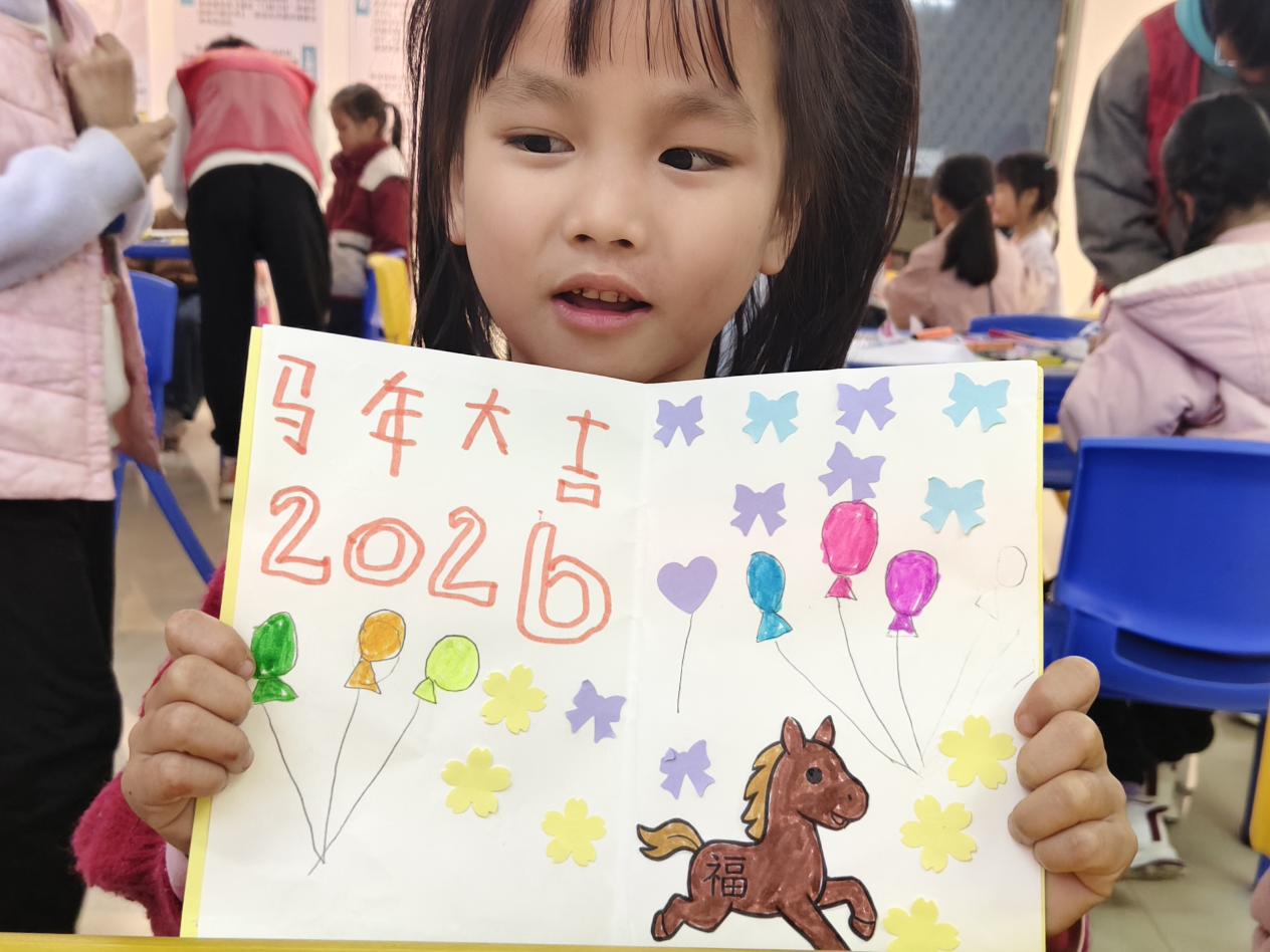 活动现场,志愿者为孩子们分发了彩色卡纸、水彩笔、贴纸等丰富材料。孩子们围坐桌前,充分发挥天马行空的想象力:有的用画笔细致勾勒出生肖马的轮廓,有的剪出立体的“福”字粘贴,有的画出绚烂的烟花以此辞旧迎新,还有的用稚嫩的笔触写下“马年大吉”“天天快乐”的心愿。虽然没有家长在场,但在志愿者的耐心指导下,孩子们独立完成了属于自己的第一张新年贺卡,看着五彩缤纷的作品,每个人脸上都洋溢着自豪的笑容。
