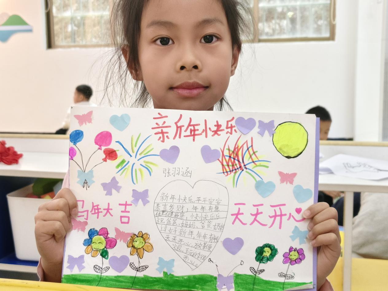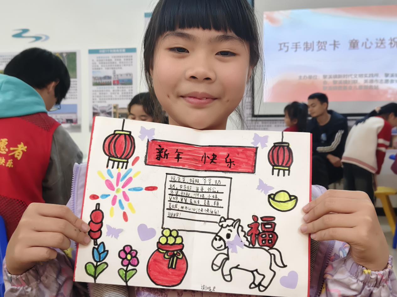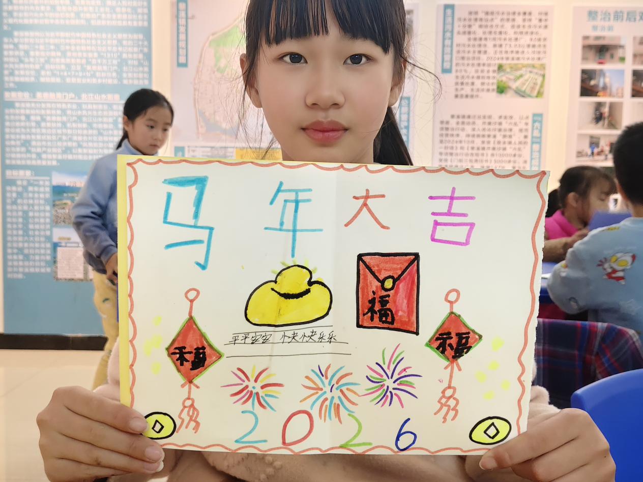 活动现场,志愿者为孩子们分发了彩色卡纸、水彩笔、贴纸等丰富材料。孩子们围坐桌前,充分发挥天马行空的想象力:有的用画笔细致勾勒出生肖马的轮廓,有的剪出立体的“福”字粘贴,有的画出绚烂的烟花以此辞旧迎新,还有的用稚嫩的笔触写下“马年大吉”“天天快乐”的心愿。虽然没有家长在场,但在志愿者的耐心指导下,孩子们独立完成了属于自己的第一张新年贺卡,看着五彩缤纷的作品,每个人脸上都洋溢着自豪的笑容。