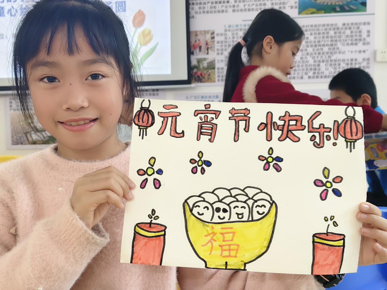 在绘画环节,孩子们化身“小画家”,用五彩画笔在纸上勾勒心中的元宵节。有的画了圆滚滚的汤圆在碗中冒热气,有的画了全家围坐吃汤圆的温馨场景,还有的画了汤圆“跳舞”的热闹场面。志愿者老师穿梭其间,鼓励孩子们大胆创作:“元宵节不仅是好吃的汤圆,更是家人团聚的温暖,把你们的感受都画出来吧!”一幅幅充满童趣的作品,展现了孩子们对团圆的理解与期待,也传递出和谐友善的文明理念。