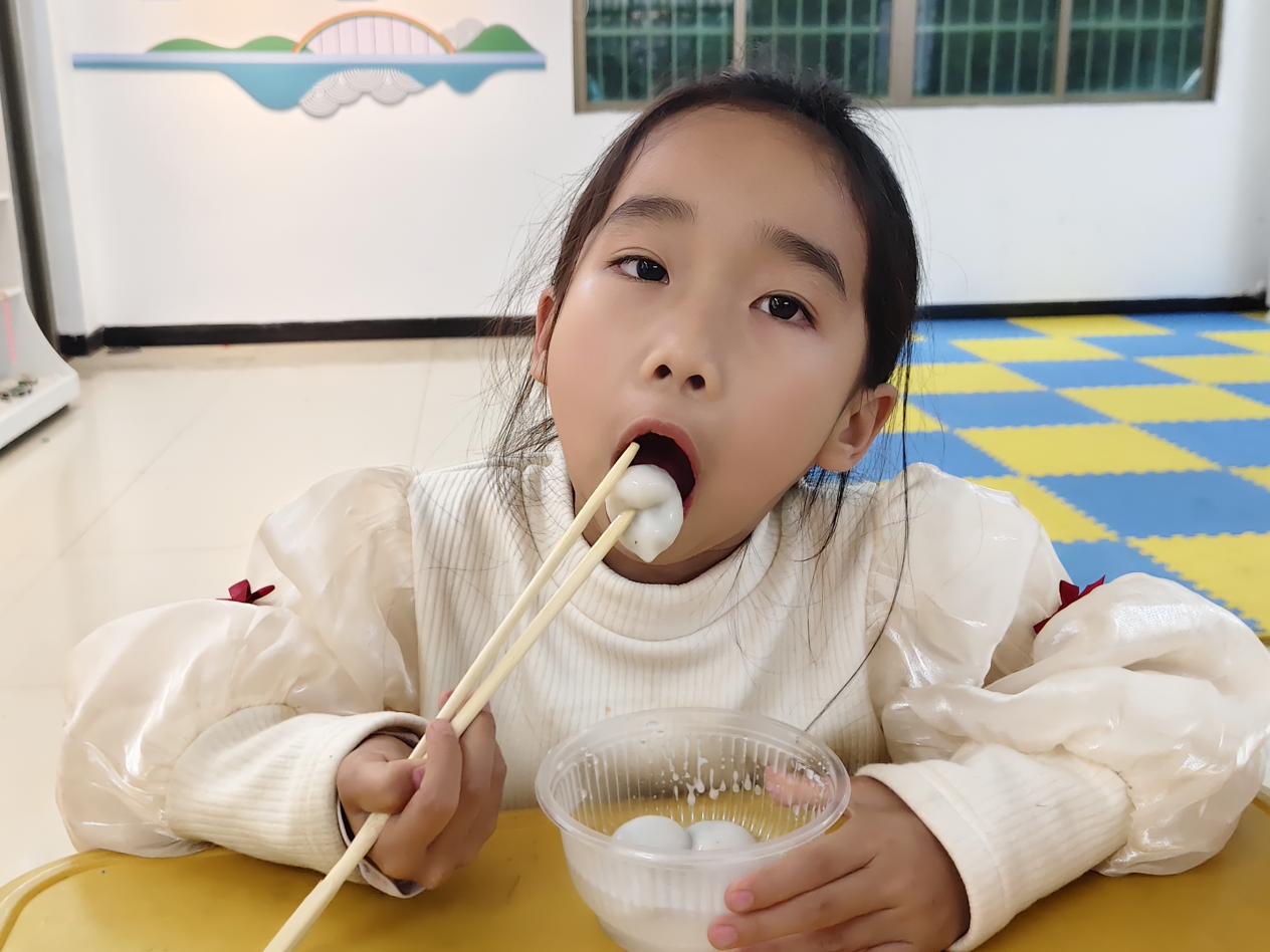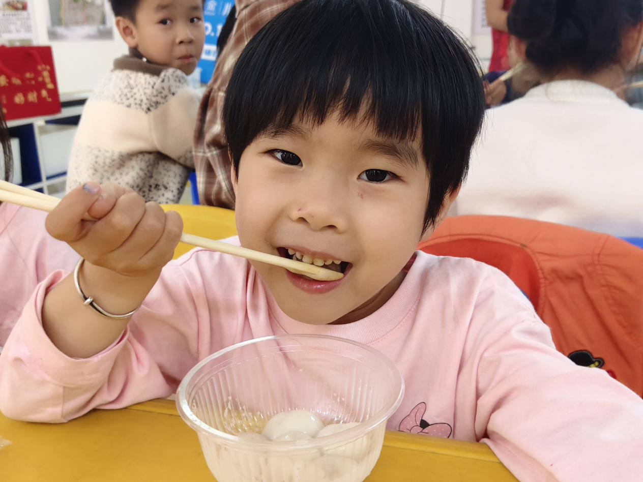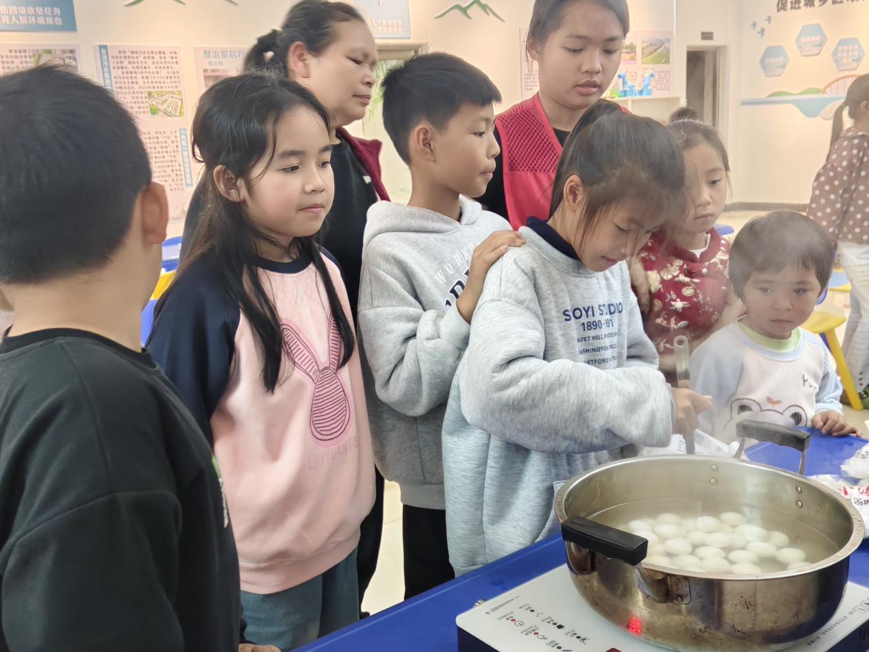 最令人期待的煮汤圆环节到了!孩子们在志愿者指导下,小心翼翼地将汤圆放入锅中,看着它们在沸水中翻滚、浮起,兴奋地欢呼:“汤圆熟啦!”当热气腾腾的汤圆端上桌,孩子们迫不及待地品尝,甜糯的味道在口中化开,幸福的笑容在脸上绽放。