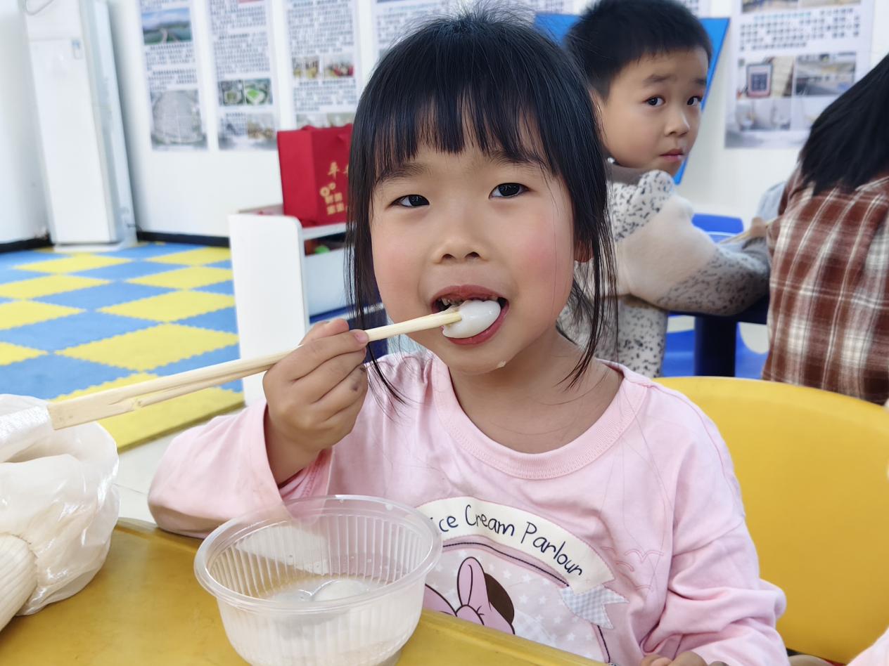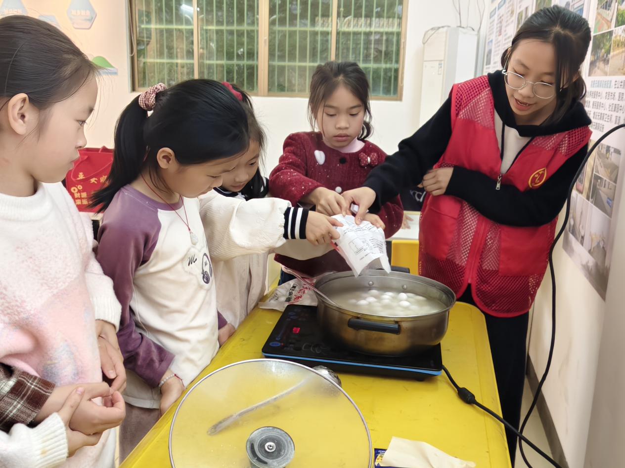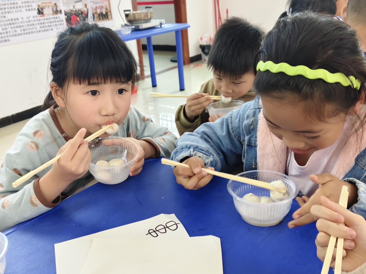 最令人期待的煮汤圆环节到了!孩子们在志愿者指导下,小心翼翼地将汤圆放入锅中,看着它们在沸水中翻滚、浮起,兴奋地欢呼:“汤圆熟啦!”当热气腾腾的汤圆端上桌,孩子们迫不及待地品尝,甜糯的味道在口中化开,幸福的笑容在脸上绽放。